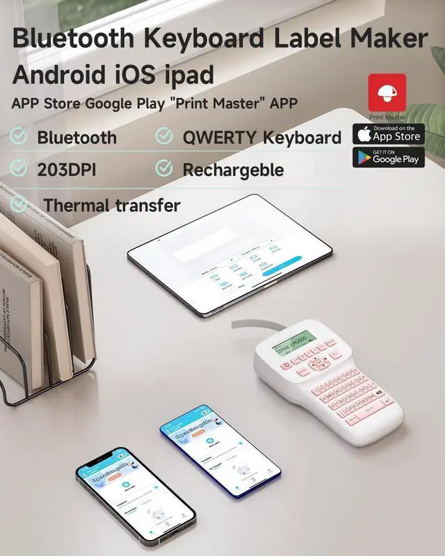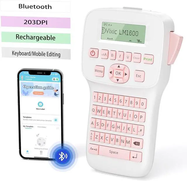 KEYBOARD BLUETOOTH LABEL MAKER - Bluetooth label maker machine with multiple pre-templates/ fonts/ icons/ borders/ languages for Smartphone QWERTY keyboard label maker with built-in cutter for the elderly and children or outdoor workers in network-less environment LM1600 labeler with backlighting LCD Screen for dark environments Auto shrink ribbon function makes label less prone to jamming.
