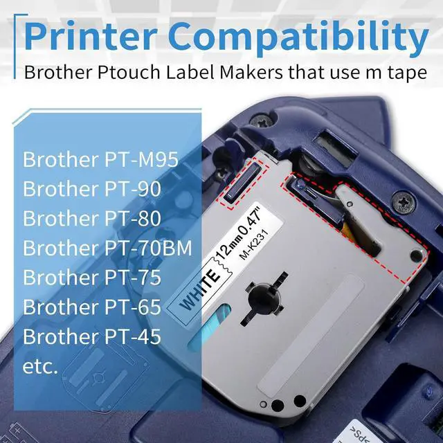 Compatible with Brother P touch Label Makers use M tape: PT-M95, PTM95, PT-70BM, PT-65, PT-45, PT-90, PT-80, PT-85, PT-70, PT-45M, PT-55BM, PT-55S, PT-65SB, PT-65SCCP, PT-65SL, PT-65VP, PT-70BBVP, PT-70BMH, PT-70HK, PT-70HOL, PT-70HOT, PT-70SP, PT-70SR, PT-80SCCP and more.
