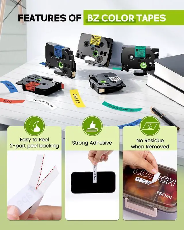 H1100 label maker machine with 1 pack sample laminated white tape, color: black on white, size: 0.47 inch x 13.1 feet (12mm x 4m). And 5 pack laminated color tapes, color: black on white/red/blue/yellow/green, size: 0.47 inch x 26.2 feet (12mm x 8m)