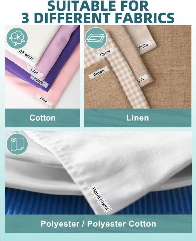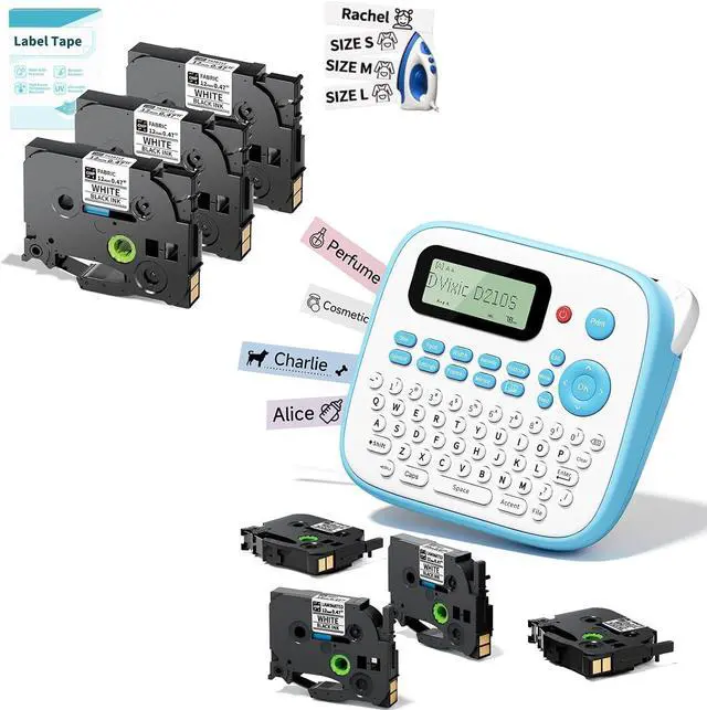 D210S label maker machine blue with 4 pack laminated tapes, color: black on white, size of each tape: 0.47 inch x 26.2 feet (12mm x 8m). And 3 pack fabirc iron-on clothing label tapes, color: Black on white, size of each tape: 0.47 inch x 9.8 feet (12mm x 3m)