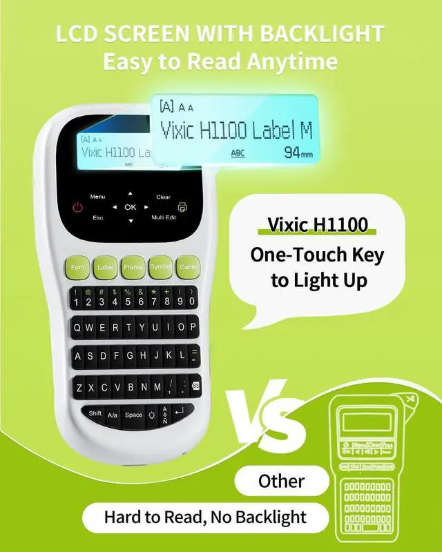 Easy to Read with Backlight Screen: Vixic H1100 portable label maker features LCD screen with built-in backlight, typing contents are effortless visibility in low-light conditions. One-Touch Keys that allow easy access to backlight, enjoy using handheld label maker even at night