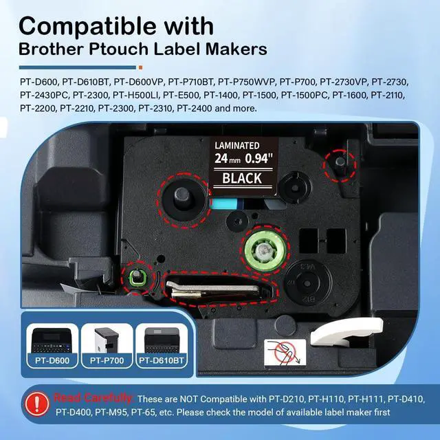 [Compatibility] Compatible with Brother Ptouch label makers that use up to 24mm 1 inch TZe label tapes: PTD600, PT-D600VP, PT-P750W, PT-P700, PT-P910BT, PT-2730VP, PT-H500LI, PT-2730, PT-2430PC, PT-2300, PT-E500, PT-1400, PT-1500, PT-1500PC, PT-1600, PT-2110, PT-2200, PT-2210, PT-2300, PT-2310, PT-2400 and more.
