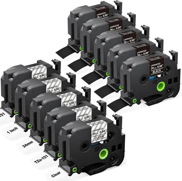 [Totally 10-Pack] 5 packs compatible with Brother TZe-151 black on clear tape and 5 packs TZe-355 white on black label tape. Width: 1 inch (24mm 0.94 inch). Length for each tape: 26.2 feet (8 meter).