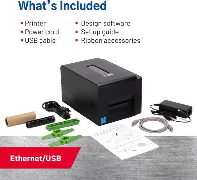 Whats Included: This thermal sticker and label printer comes with a power cord, USB cable, labeling software, setup installation guide, and ribbon accessories. The tag and shipping label maker machine measures 11.02 x 8.03 x 11.02 inches.