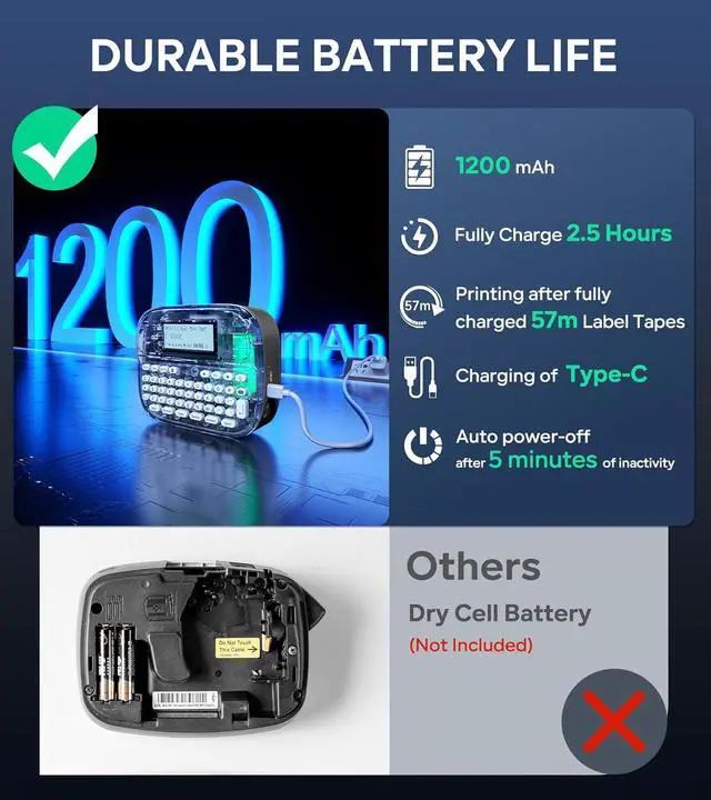 :Vixic label maker eliminates the need to waste money on disposable batteries and USB-C cables! The M950 labeler machine with tape comes with a built-in 1200mAh rechargeable lithium battery for repeated use. With a full charge, you can edit and print up to 280 2-inch labels, and the long-lasting battery ensures uninterrupted use. Mini handheld label maker machine with one roll of MZ tape and a USB-C cable, allowing you to enjoy the excitement of get