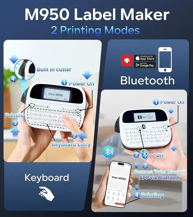 : Vixic M950 portable labels maker machine supports both keyboard and bluetooth printing . Label maker with keyboard and tape allows for quick label creation. Power it on, edit, and print in just 10 seconds. Additionally, the Bluetooth label maker connects to the "Print Master" app, giving you free access to a variety of patterns, borders, and font styles to create your own custom labels, all without collecting your personal information, so you can use them wit