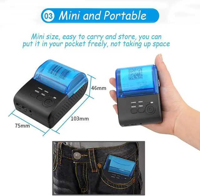 BASIC FUNCTION - This mobile Bluetooth receipt printer has a large paper warehouse, supporting a 58mm diameter. Printer built-in rechargeable 1500mAh lithium-ion battery, standby time can reach 5 - 6 days. Bluetooth 4.0 printer with a printing speed of 90mm/sec, with auto sleep, auto awake function, save electricity.