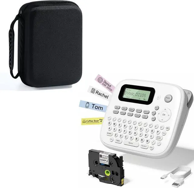 Package Included: D210S label maker machine white with 1 sample laminated tape, color: black on white, size: 0.47 inch x 13.1 feet (12mm x 4m). And 1 pack case, external size: 8.7" x 6.7" x 3.9"