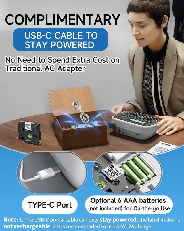 Power-Ready Label Maker: Ready to use right out of the box with the included USB-C cable. Eliminating the extra cost of purchasing traditional AC adapter. Using a direct power supply can extend the label maker's lifespan by up to 5 years compared to rechargeable labelers. Additionally, you can choose to use the optional 6 AAA batteries (not included) for convenient portable use