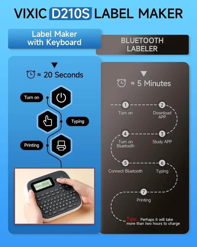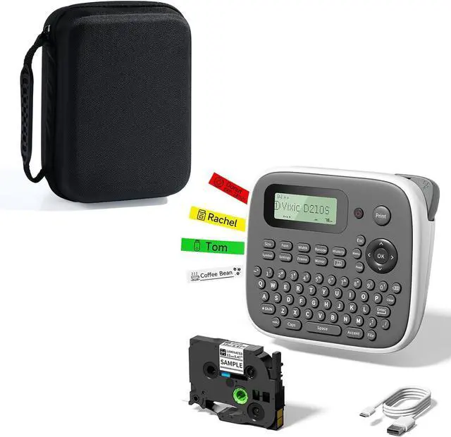 Vixic D210S Label Maker Machine with Tape, Easy to Use for All Ages: No need for mobile device connections! The D210S label maker with keyboard simplifies the process for everyone, including kids and the elderly. From powering on to editing and printing, it only takes 20 seconds! Experience quick and effortless labeling