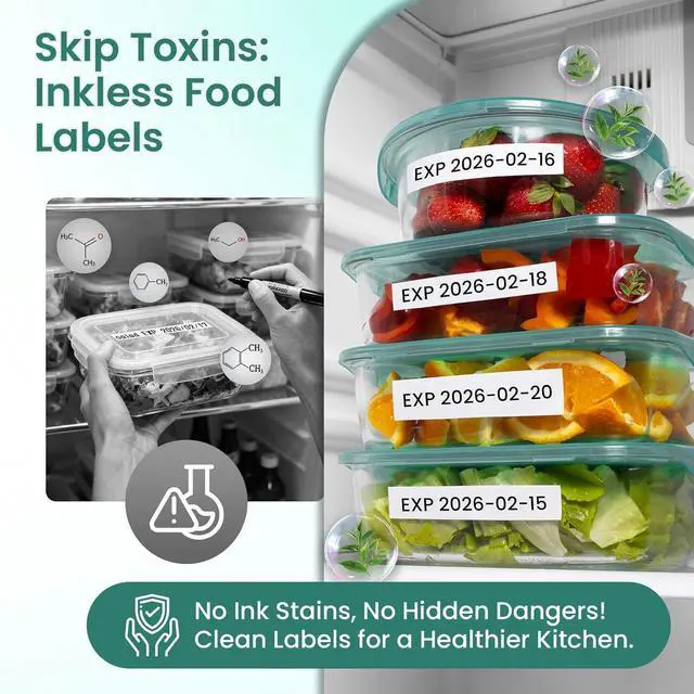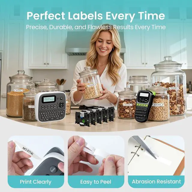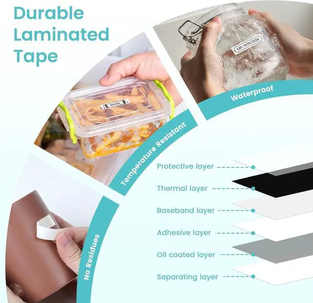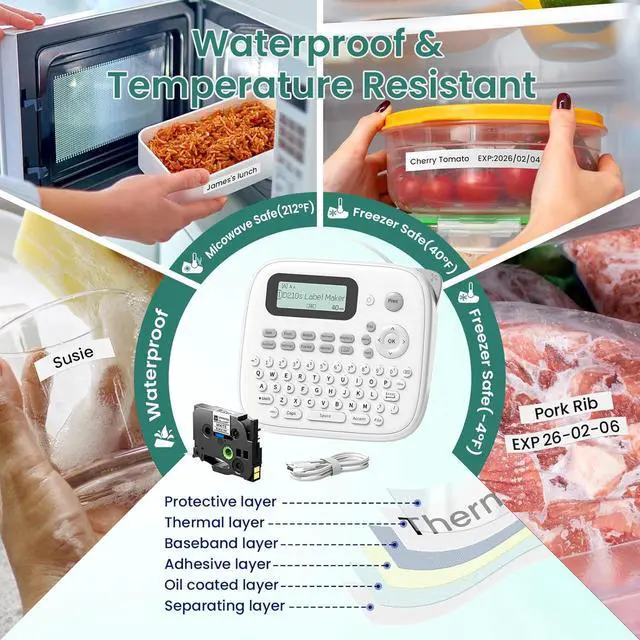 : Our label maker with waterproof labels are ideal for indoor and outdoor use. Easily stick labels on kids' school items, file folders, kitchen containers, jars, storage bins, school supplies, etc