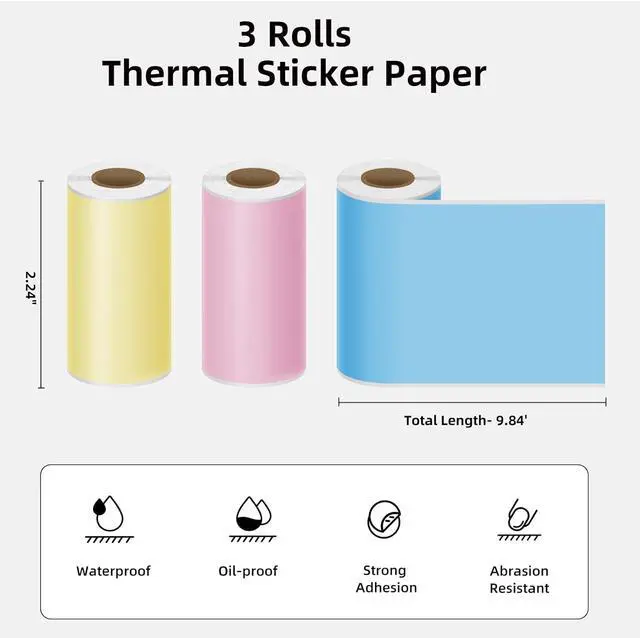 Three Colors: Includes three rolls of self-adhesive thermal paper in Yellow, Pink, and Blue, each measuring 2.24 inches (57 mm) in width and 9.84 feet (3 meters) in length; Perfect for a variety of printing needs, from study notes to DIY projects
