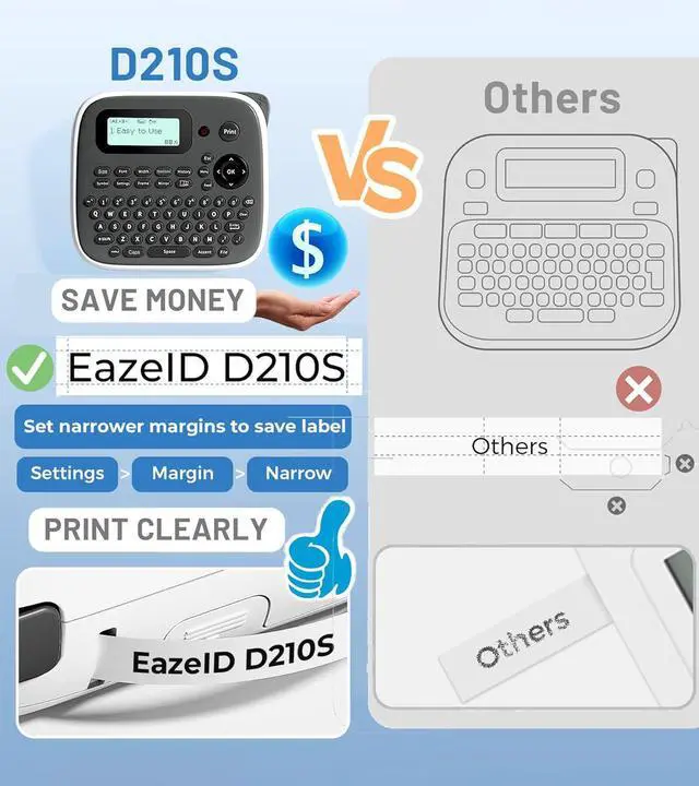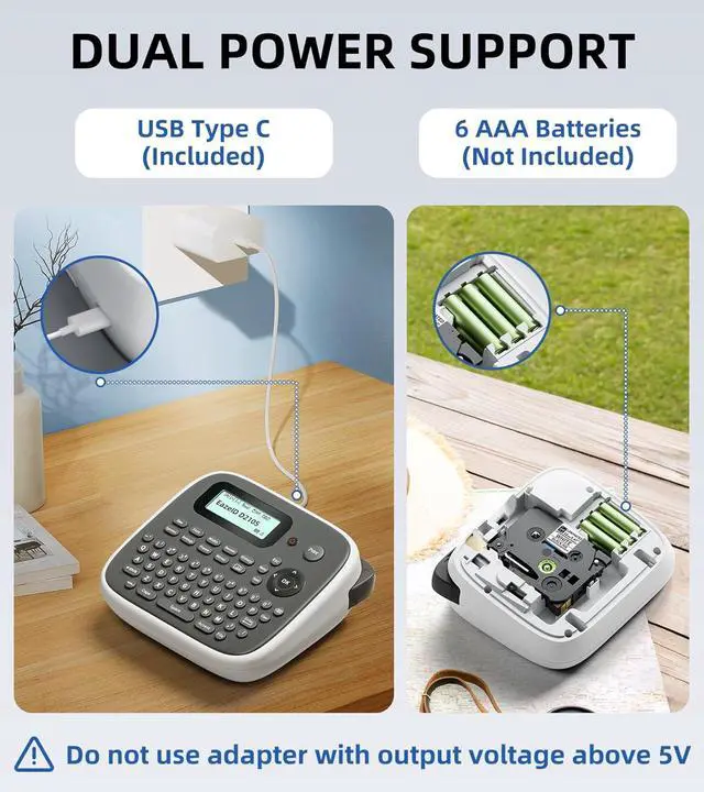 Power Supply : The EazeID D210S portable label maker machine with tape can be powered by either the Type-C (included) or 6 AAA batteries (not included), providing flexibility to use it anywhere and any time