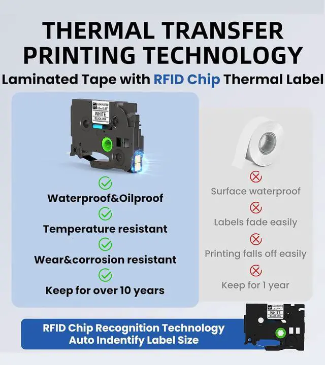 Durable and Long-lasting Labels : Utilizing thermal transfer printing, the EazeID label maker machine produces laminated labels waterproof, abrasion, fading, and temperature changes. These labels are perfect for both indoor and outdoor use. The label maker comes with a 1-Pack black on white label tape measuring 1/2 inch wide x 13 feet long