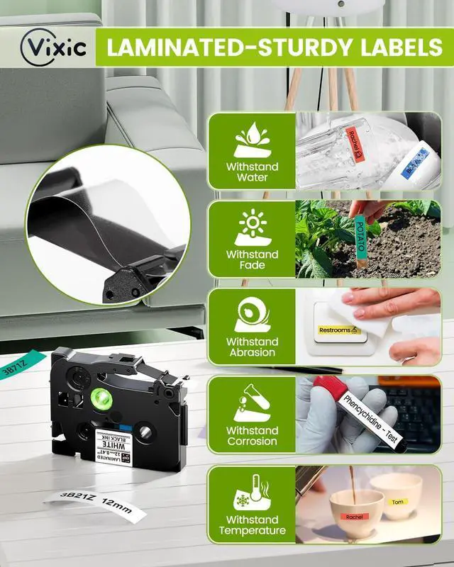 Durable Indoor or outdoor labels. These Laminated label tapes are water resistant, grime resistant, grease resistant, temperature resistant, abrasion resistant, chemical resistant as well as fading resistant