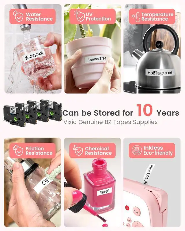 Label Maker Waterproof Labels: D210S label maker machine with tape waterproof uses 7-Layer lamination technology, ensuring long-lasting quality for up to 10 years. BZ laminated white tape is durable and resistant to abrasion, water, fading and temperature. You can effortlessly transition from freezer to microwave to dishwasher in the kitchen. Enjoy the convenience of using it both indoors and outdoors