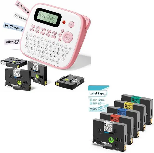 D210S label maker machine with 4 pack laminated white tapes, color: black on white, size: 0.47 inch x 26.2 feet (12mm x 8m). And 5 pack laminated color tapes, color: black on white/red/blue/yellow/green, size: 0.47 inch x 26.2 feet (12mm x 8m)
