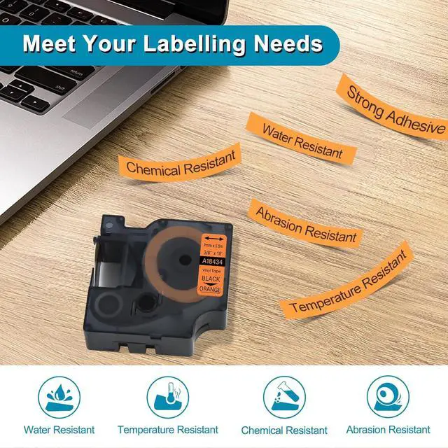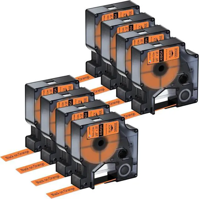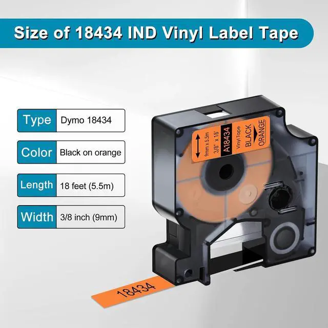 Package Includes: 8 pack KCMYTONER compatible for dymo rhino 18434 vinyl permanent label tape; color: black print on orange tape; size: 3/8 inch (9mm) x 18 feet (5.5m)