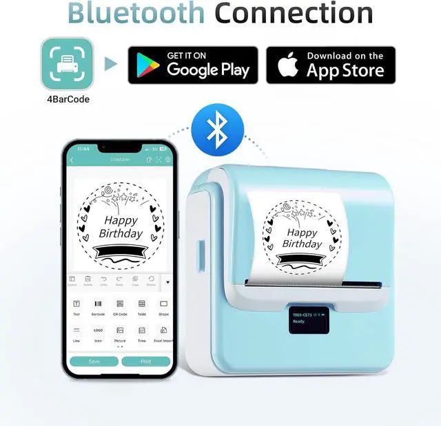 Powerful App: With Bluetooth connectivity, you can use the free 4Barcode app, which offers over 150 ready-to-use label templates to boost your efficiency; You can also design and save your own templates with access to 80+ fonts and 670+ icons; The app supports a variety of features, including QR codes, barcode labels, tables, materials, timestamps, numbers, text, icons, and more, enabling fully customized label creation