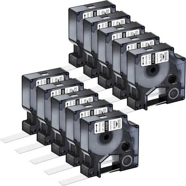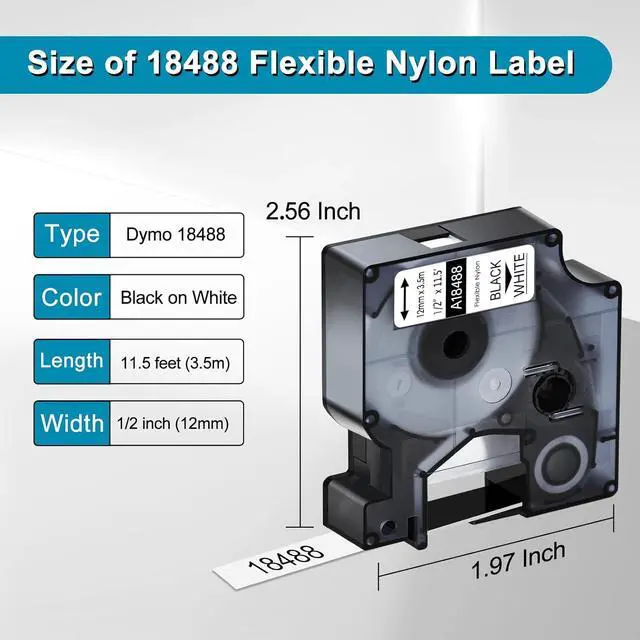 Package Includes: 10 pack KCMYTONER compatible for dymo 18488 flexible nylon label tape; color: black print on white tape; size: 1/2 inch (12mm) x 11.5 feet (3.5m)