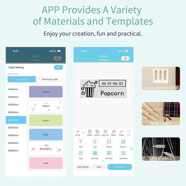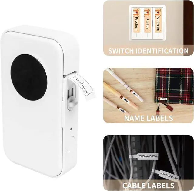 Multifunctional Label Printer - Mini and portable label printer able to print various stickers such as prince , text, icon, frame, picture, time, 1D code, QR code, line etc. Widely used in home storage, makeup remark, journal making, office, study.
