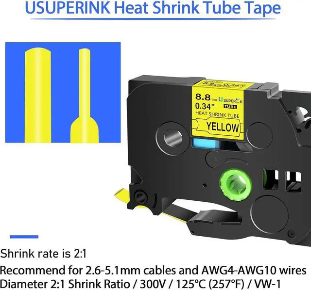 USUPERINK HSe-621 heat shrink tubes label tapes are perfect to mark cables,fibers and wires and can be used for cables in diameter 2.6 mm (0.1inch) and 5.1 mm (0.2inch)