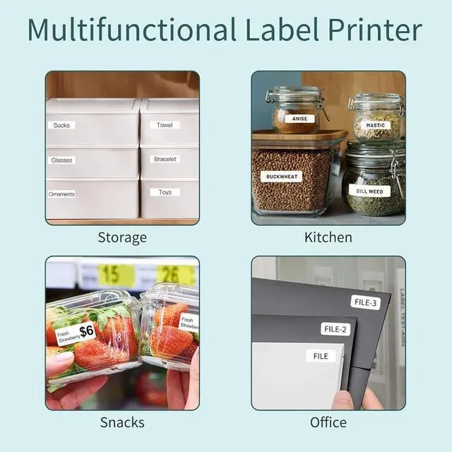 Multifunctional Label Printer - Mini and portable label printer able to print various stickers such as prince , text, icon, frame, picture, time, 1D code, QR code, line etc. Widely used in home storage, makeup remark, journal making, office, study.