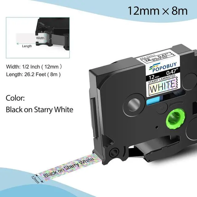 Package contains: 8 pack replacement compatible for ptouch TZ-231L1 AZe-231L1 12mm 0.47'' laminated starry glitter rainbow label tape; color: black on starry white; size: length: 8m (26.2 feet); width: 12mm (1/2 inch or 0.47'')