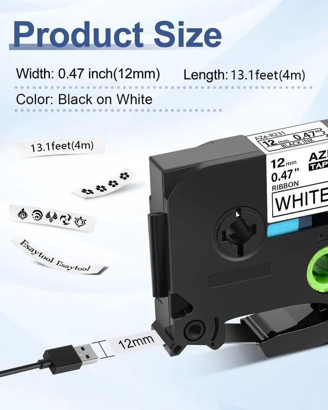 Product InformationEsaytool 10 Pack Compatible with P-touch TZeR231 AZER231 TZR231 Labeling Tape; Color: Black Print on White Text; Width:0.47 inch(12mm), Length:13.1 feet(4m).