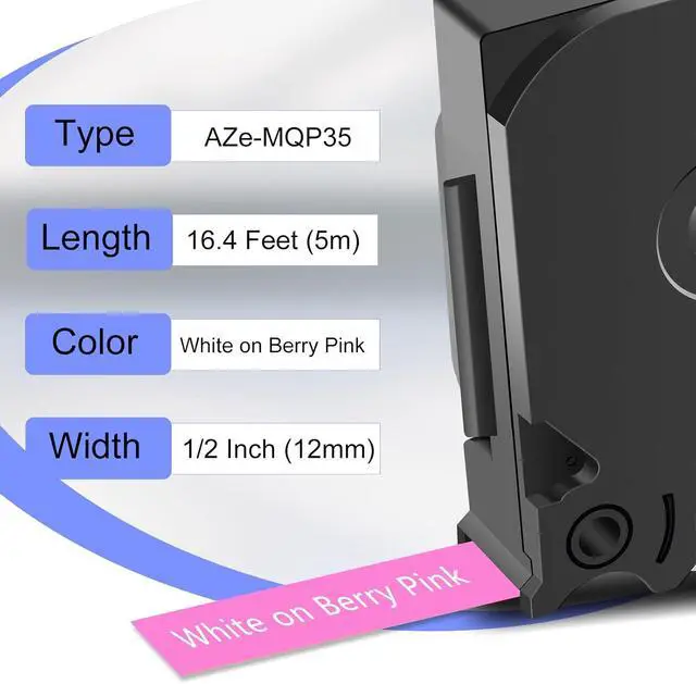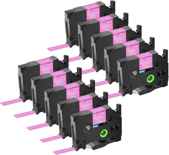 Package Included: 10 pack KCMYTONER compatible for p-touch TZe-MQP35 TZ-MQP35 laminated label tape; color: white text on berry pink tape; size: 0.47 inch (12mm) x 16.4 feet (5m).