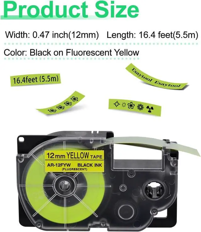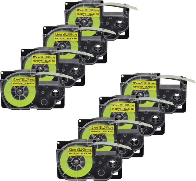 Product InformationEsaytool 8 Pack Compatible with Cassette XR12FYW XR-12FYW XR-12FYW2S XR12FYW2S Labeling Tape; Color: Black Print on Fluorescent Yellow Text; Width:0.47 inch(12mm), Length:16.4 feet(5.5m).