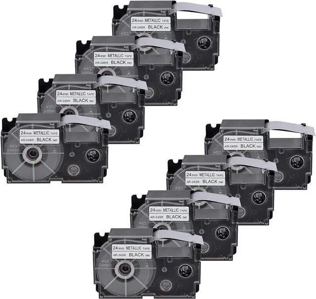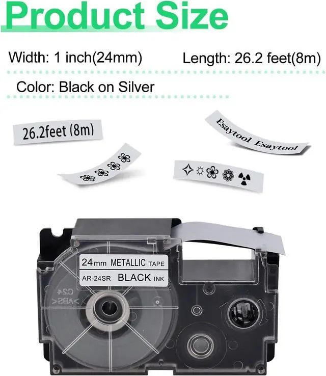 Product InformationEsaytool 8 Pack Compatible with Cassette XR24SR XR-24SR XR-24SR2S XR24SR2S Labeling Tape; Color: Black Print on Silver Text; Width:1 inch(24mm), Length:26.2 feet(8m).