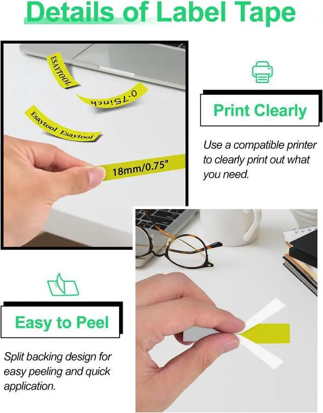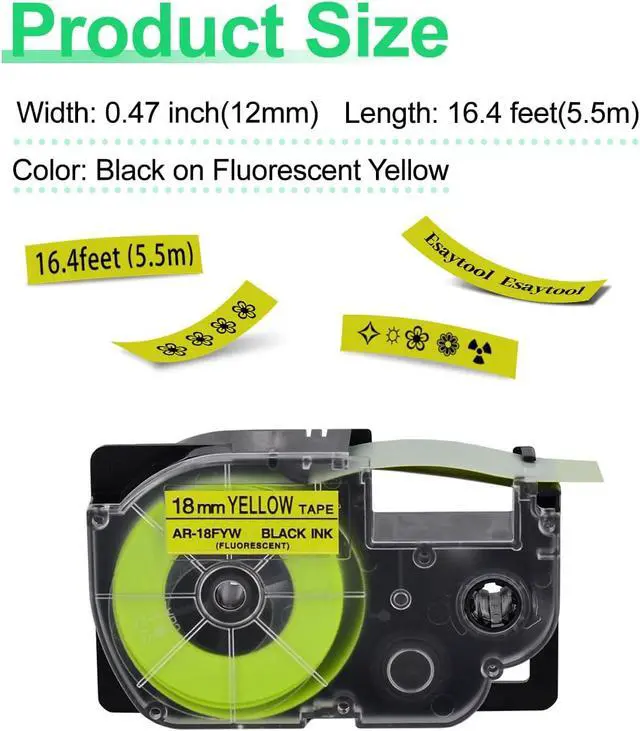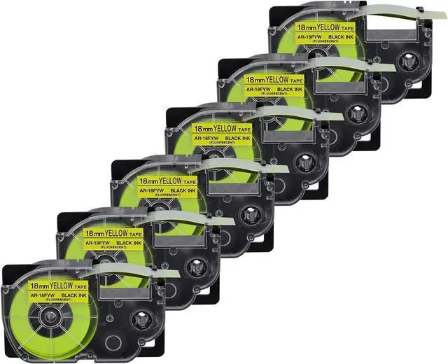 Product InformationEsaytool 6 Pack Compatible with Cassette XR18FYW XR-18FYW XR-18FYW2S XR18FYW2S Labeling Tape; Color: Black Print on Fluorescent Yellow Text; Width:0.75 inch(18mm), Length:16.4 feet(5.5m).