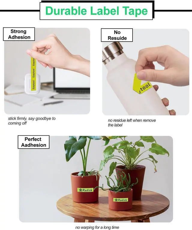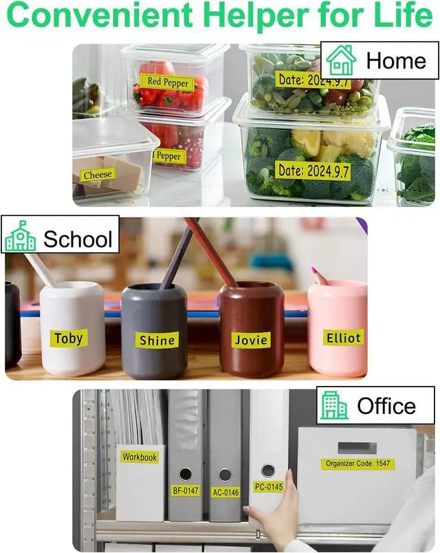 ApplicationsUses: Ideal for item classification, date labeling, operating instructions, pricing, personal name tags, DIY messages, and more. Applicable environments: Perfect for use in homes, offices, schools, hospitals, government agencies, hotels, restaurants, factories, banks, laboratories, warehouses, farms, repair shops, retail stores, and supermarkets.