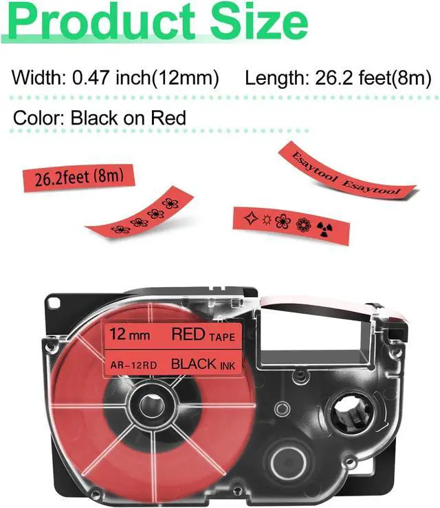 Product InformationEsaytool 20 Pack Compatible with Cassette XR12RD XR-12RD XR-12RD2S XR12RD2S Labeling Tape; Color: Black Print on Red Text; Width:0.47 inch(12mm), Length:26.2 feet(8m).