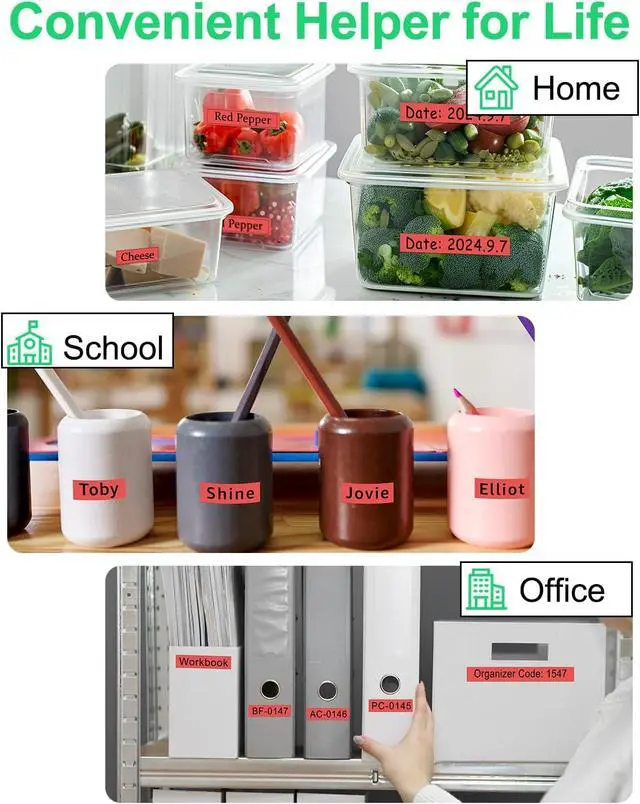 ApplicationsUses: Ideal for item classification, date labeling, operating instructions, pricing, personal name tags, DIY messages, and more. Applicable environments: Perfect for use in homes, offices, schools, hospitals, government agencies, hotels, restaurants, factories, banks, laboratories, warehouses, farms, repair shops, retail stores, and supermarkets.