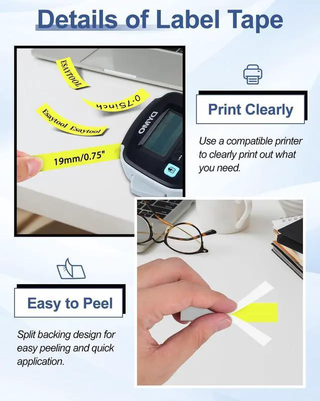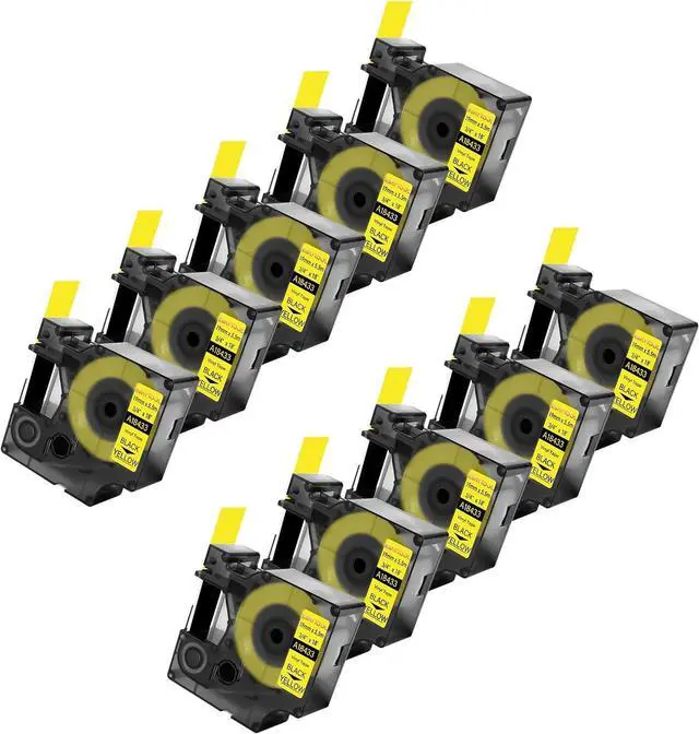 Product InformationEsaytool 10 Pack Compatible with Dymo Vinyl Permanent 18433 A18433 Labeling Tape; Color: Black Print on Yellow Text; Width:0.75 inch(19mm), Length:18 feet(5.5m).