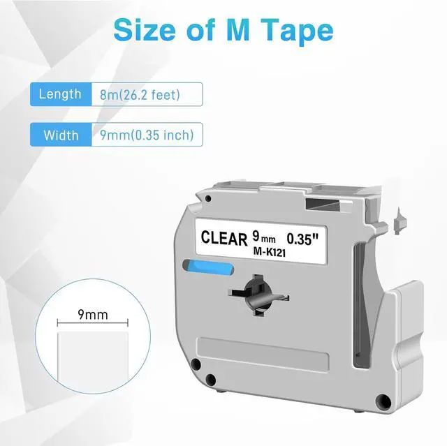 Product InformationEsaytool 20 Pack Compatible with P-touch M-K121 MK121 M121 Labeling Tape; Color: Black Print on Clear Text; Width:0.35 inch(9mm), Length:26.2 feet(8m).