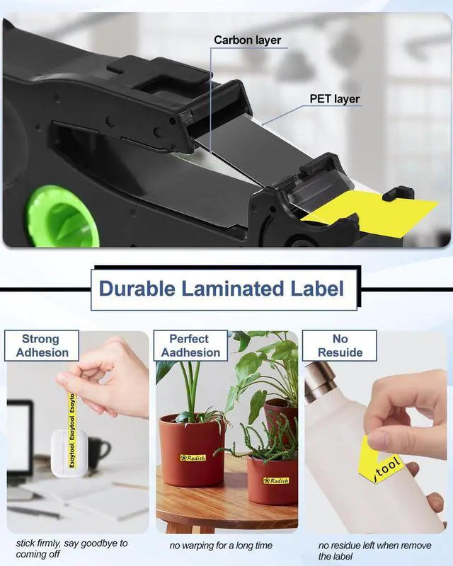 FeaturesLaminated extra strength adhesive tapes: split backing for simple application. Printing is smooth and lag-free, with clear, easy-to-read text.The backing tape splits cleanly down the middle for easy peeling. It leaves no sticky residue after label removal.