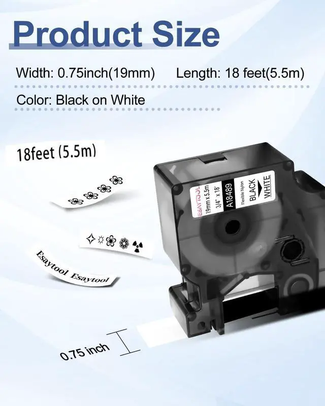 Product InformationEsaytool 10 Pack Compatible with Dymo Flexible Nylon 18489 A18489 Labeling Tape; Color: Black Print on White Text; Width:0.75 inch(19mm), Length:18 feet(5.5m).