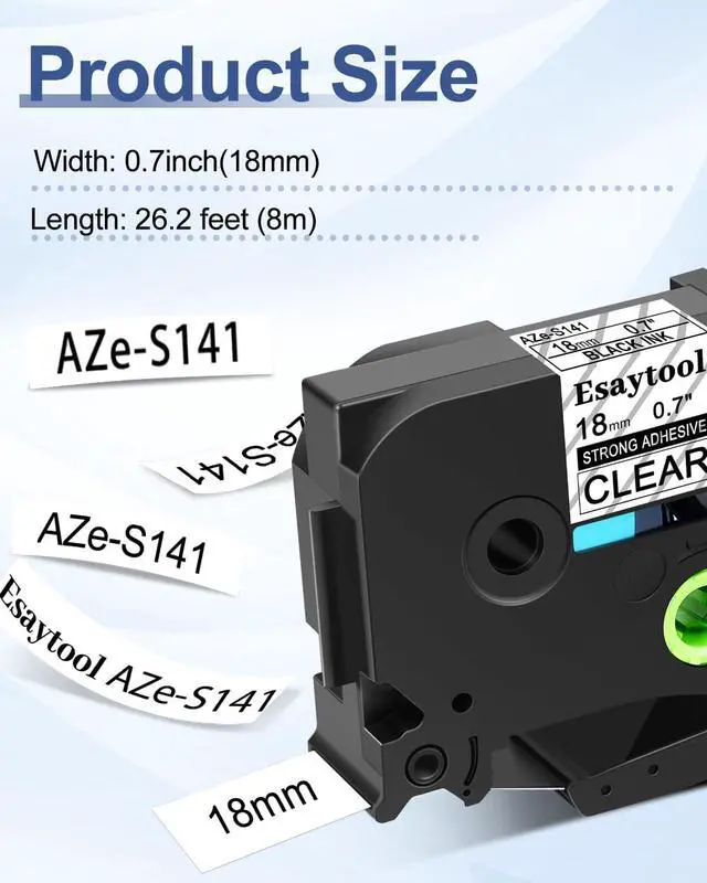 Product InformationEsaytool 20 Pack Compatible with P-touch TZeS141 AZES141 TZS141 Extra Strength Adhesive Laminated Tape; Color: Black Print on Clear Text; Width:0.7 inch(18mm), Length:26.2 feet(8m).