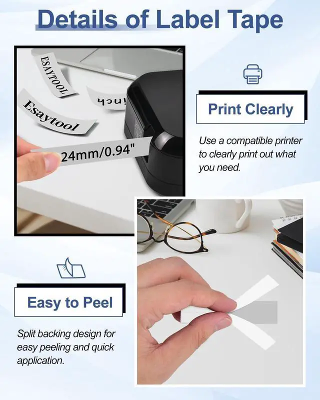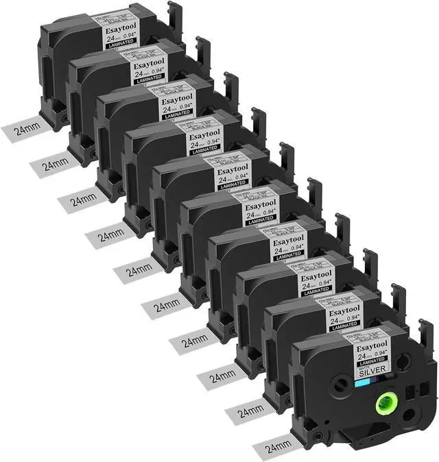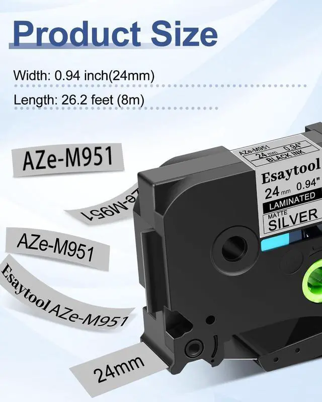 Product InformationEsaytool 10 Pack Compatible with P-touch TZeM951 AZEM951 TZM951 Labeling Tape; Color: Black Text on Matte Silver Tape; Width:0.94 inch(24mm), Length:26.2 feet(8m).