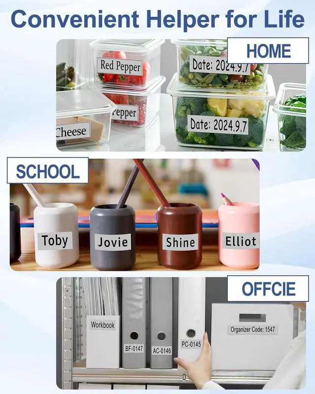 ApplicationsUses: Ideal for item classification, date labeling, operating instructions, pricing, personal name tags, DIY messages, and more. Applicable environments: Perfect for use in homes, offices, schools, hospitals, government agencies, hotels, restaurants, factories, banks, laboratories, warehouses, farms, repair shops, retail stores, and supermarkets.