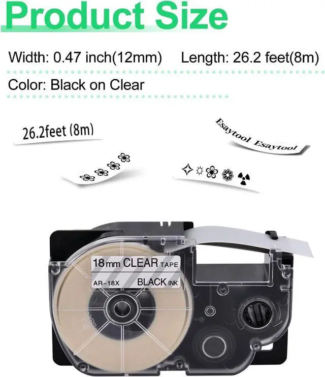 Product InformationEsaytool 10 Pack Compatible with Cassette XR18X XR-18X XR-18X2S XR18X2S Labeling Tape; Color: Black Print on Clear Text; Width:0.75 inch(18mm), Length:26.2 feet(8m).