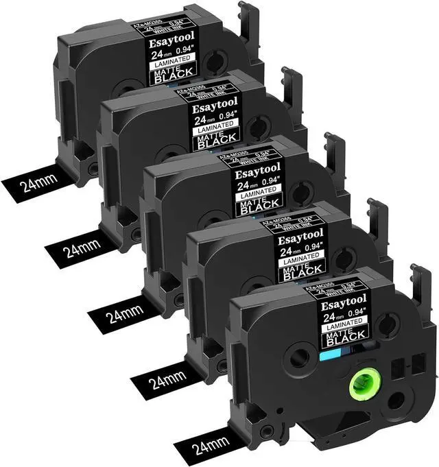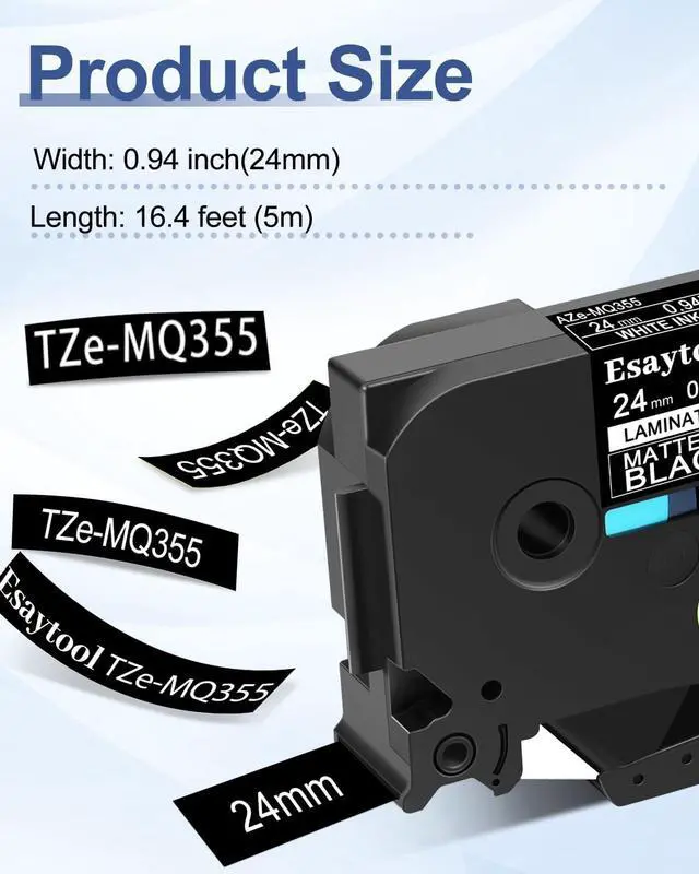 Product InformationEsaytool 5 Pack Compatible with P-touch TZeMQ355 AZEMQ355 TZMQ355 Labeling Tape; Color: White Print on Matt Black Text; Width:0.94 inch(24mm), Length:16.40 feet(5m).