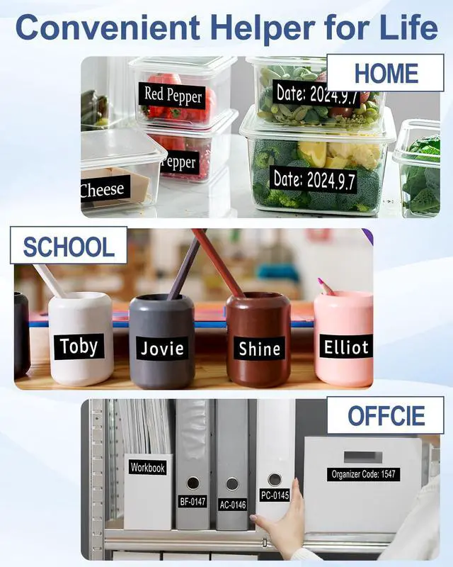 ApplicationsUses: Ideal for item classification, date labeling, operating instructions, pricing, personal name tags, DIY messages, and more. Applicable environments: Perfect for use in homes, offices, schools, hospitals, government agencies, hotels, restaurants, factories, banks, laboratories, warehouses, farms, repair shops, retail stores, and supermarkets.