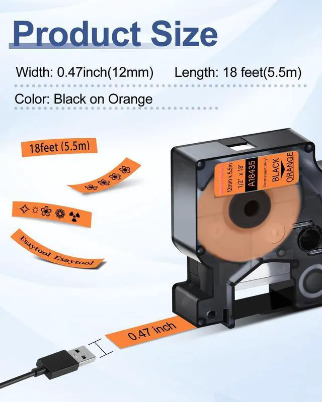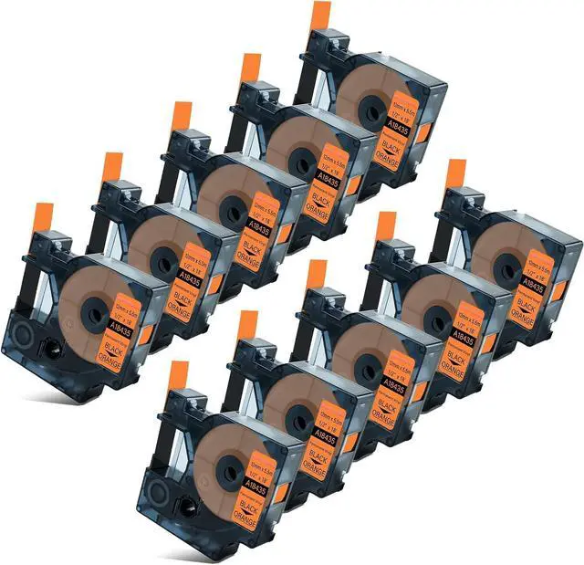 Product InformationEsaytool 10 Pack Compatible with Dymo Vinyl Permanent 18435 A18435 Labeling Tape; Color: Black Print on Orange Text; Width:0.47 inch(12mm), Length:18 feet(5.5m).