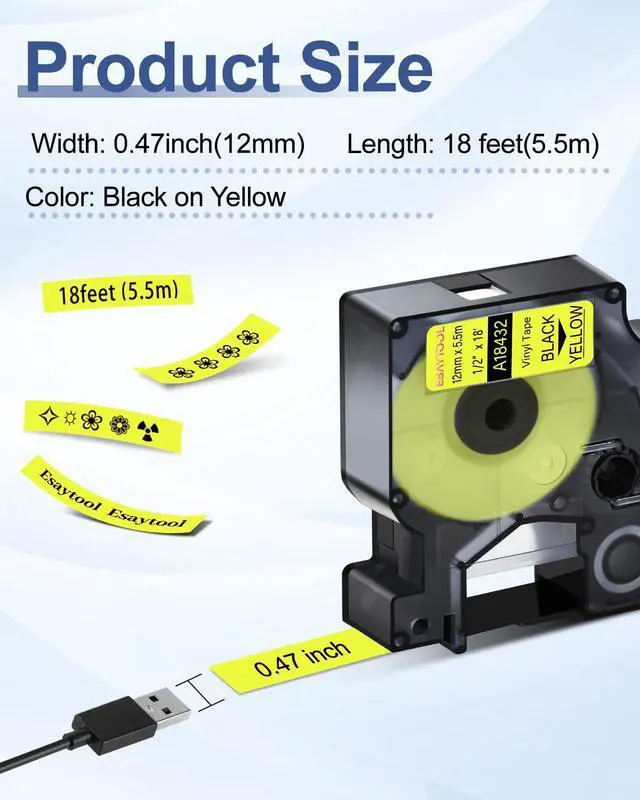 Product InformationEsaytool 10 Pack Compatible with Dymo Vinyl Permanent 18432 A18432 Labeling Tape; Color: Black Print on Yellow Text; Width:0.47 inch(12mm), Length:18 feet(5.5m).