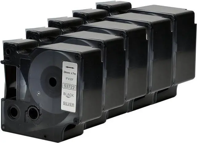 Color & Dimesion:Compatible with D1 dymo label tape color:Black print on silver;Size:1 inch (24mm) widthx23 feet(7m)length,d1 dymo tape comes in a variety of colors and sizes.5rolls labeling tape packed in a box