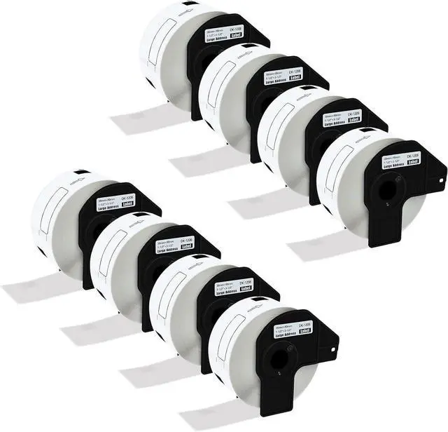 Package Includes: 8 roll KCMYTONER compatible for DK-1208 die-cut large address thermal direct label; color: black print on white tape; size: 1.4 in x 3.5 in (38mm x 90mm), 400 labels per roll.